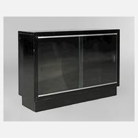 deutsch, 1930er Jahre, schwarz polierter Korpus mit Glasschiebetüren, die Schienen aus Aluminium, innen ein höhenverstellbarer Einlegeboden, im Sockelbereich Rissbildung, die Rückwand mit restauriertem Loch, sonst guter Originalzustand, Maße 70 x 100 x 30 cm.