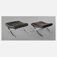 Modell 251, Entwurf Mies van der Rohe 1929, Ausführung wohl Knoll International, 1960er Jahre, vierteiliges verschraubtes Gestell aus verchromtem Bandstahl, Auflagen und Bespannung aus schwarzem Leder, ein Sitzkissen mit Einriss, das andere bereits alt repariert, Maße je 37 x 55 x 57 cm.