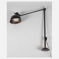 1930er Jahre, gemarkt, geschwärztes Eisengehäuse mit Aluminiumschirm, runde Wand- bzw. Tischmontierung mit Kugelgelenk, daran zweiteiliger, mittels Rädelschraube variabel neigbarer Lampenarm, einflammig elektrifiziert, Verkabelung erneuert, oberflächliche Altersspuren, L max. 120 cm.