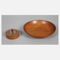 in der Art von Eberhard Schrammen, um 1925, ungemarkt, Obstholz klar lackiert, schlichte gemuldete Schale und flache Runddose mit aufgelegtem, abnehmbarem Flachdeckel aus Klarglas mit zylindrischem Holzknauf, min. Altersspuren, D 9 und 22 cm.