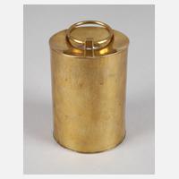 Friedrich Marby (Bauhausschüler um 1924-25), wohl 1930er Jahre, Messing, zylindrische Wandung, im konkav gewölbten Stülpdeckel Ringgriff an kleinem Würfelelement, martellierte Oberfläche, leichte Altersspuren, H ca. 12,5 cm, H total 17,5 cm. D ca. 9 cm. Provenienz: Sammlung Giorgio Silzer