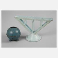 Entwurf für die Ruppelwerke Gotha um 1930, schwarze Stempelmarken, Ständer mit Schriftzug mehrfach geschützt, Blech in Blautönen lackiert, geometrische Gestaltung, Spardose mit originalem Schlüssel, partiell korrodiert, H 8 und 13,5 cm.