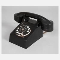 Modell Neues Frankfurt, Entwurf 1929, Hersteller Fuld & Co., Frankfurt a. M., ungem., 1930er Jahre, schwarzes Bakelit, Messingblech geschwärzt bzw. vernickelt, Wählscheibe weiß emailliert, Oberfläche mit Alters- und Gebrauchsspuren, Verkabelung rest.bed., H 13 x B 11 x T 15,5 cm, L Hörer 24,5 cm.