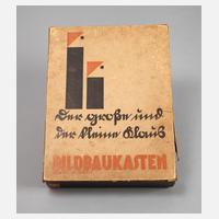 Bildbaukasten "Der große und der kleine Klaus", Entwurf Erich Clauss, Deckel-Typographie Herbert Bayer attr., Verlag Franz Schmidt & Co. Georgenthal, um 1930, pädagogisches Legespiel mit zahlreichen farbigen Filzstücken, Grundplatte, Bilderrahmen, einem Maßstab (von 2), Pinzette, steckbarer Aufstellvorrichtung, Bauanleitung im Deckel, Vorlagenheft mit farblich entsprechenden Abbildungen (Motive: Rotkäppchen, Elefant, Kinderspielzimmer etc.) und originalem Karton mit Inneneinteilung, seltenes, vom Konstruktivismus und Bauhaus beeinflusstes Legespiel mit Alters- und Gebrauchsspuren, ein Maßstab fehlt, Heftfalz verstärkt und Deckelseiten lädiert, Maße Kasten 29 x 22 x 5,5 cm.