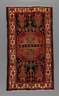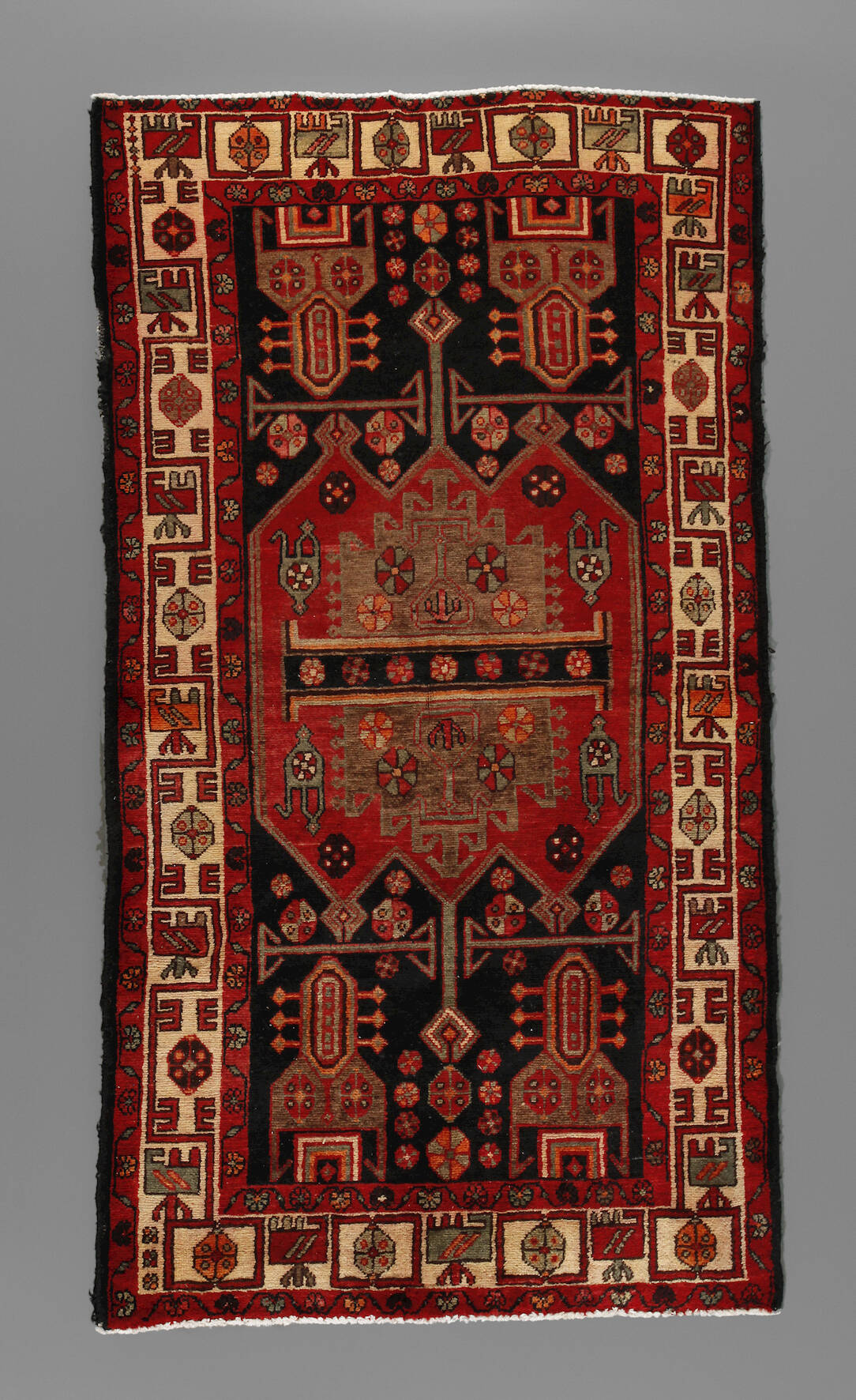 Iran, 2. Hälfte 20. Jh., plakativer geometrischer Dekor über dunklem Fond, hell abgesetzter Bordürenbereich, verkürzt, Gebrauchsspuren, Maße 225 x 128 cm.