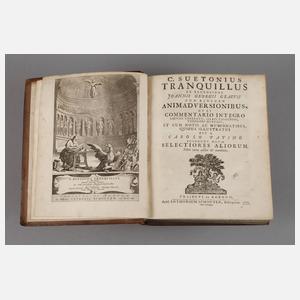 C. Suetonius Tranquillus ex recencione Joannis Georgii Graevii cum eiusdem Animadversionibus ut et Commentario Integro [...] et cum notis ac numismatibus quibus illustratus est a Carolo Patino accedunt notae selectiores aliorum, editio tertia, Trajecti ad Rhenum [Utrecht] bei Anthonius Schouten 1703, Format Gr. 8°, 829 und 110 S., dem Titelkupfer vorgebunden Prämienurkunde: "Sedulum ac diligentem Adolescentem L. J. van Rhyn, ex tertia in quartam classem dimissum, hoc praemio donarunt [...] examine hiberno 1827", mit sechs Autogrammen, prächtiger Ledereinband, numismatische Holzschnitte, altersgemäß sehr schön erhalten.