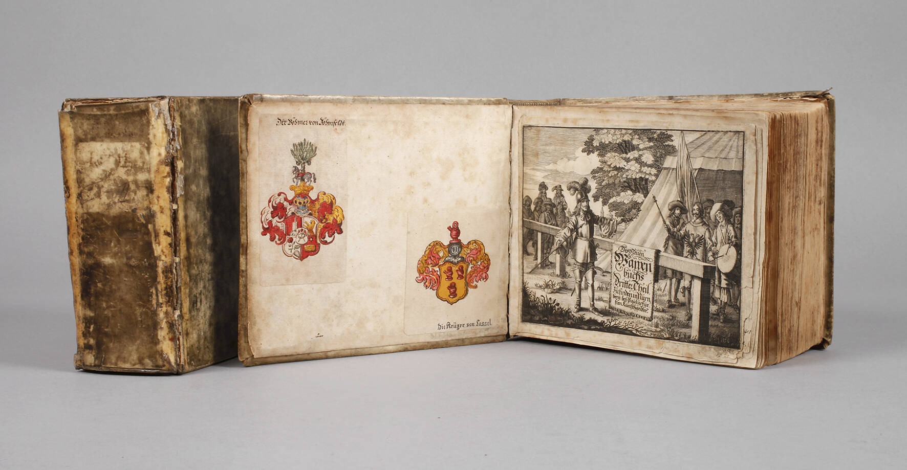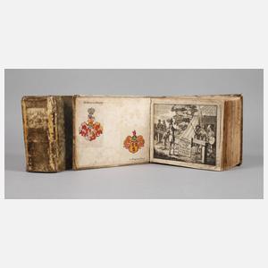 in welchem deß H. Römischen Reiches hohe Potentanten, Fürsten, Grafen, Herren, Freyherren, Edle, Stände und Städte etc., Wappen, Schilde, Helm, Kleinodien [...] außgebildet zuersehen, 4 Teile in 2 Bdn., Nürnberg bei Paulus Fürsten o. J. [1670], Format Maße ca. 16,5 x 20 cm, zahlreiche kolorierte Kupfer, Pergamenteinbände, normale Altersflecken und Gebrauchsspuren.