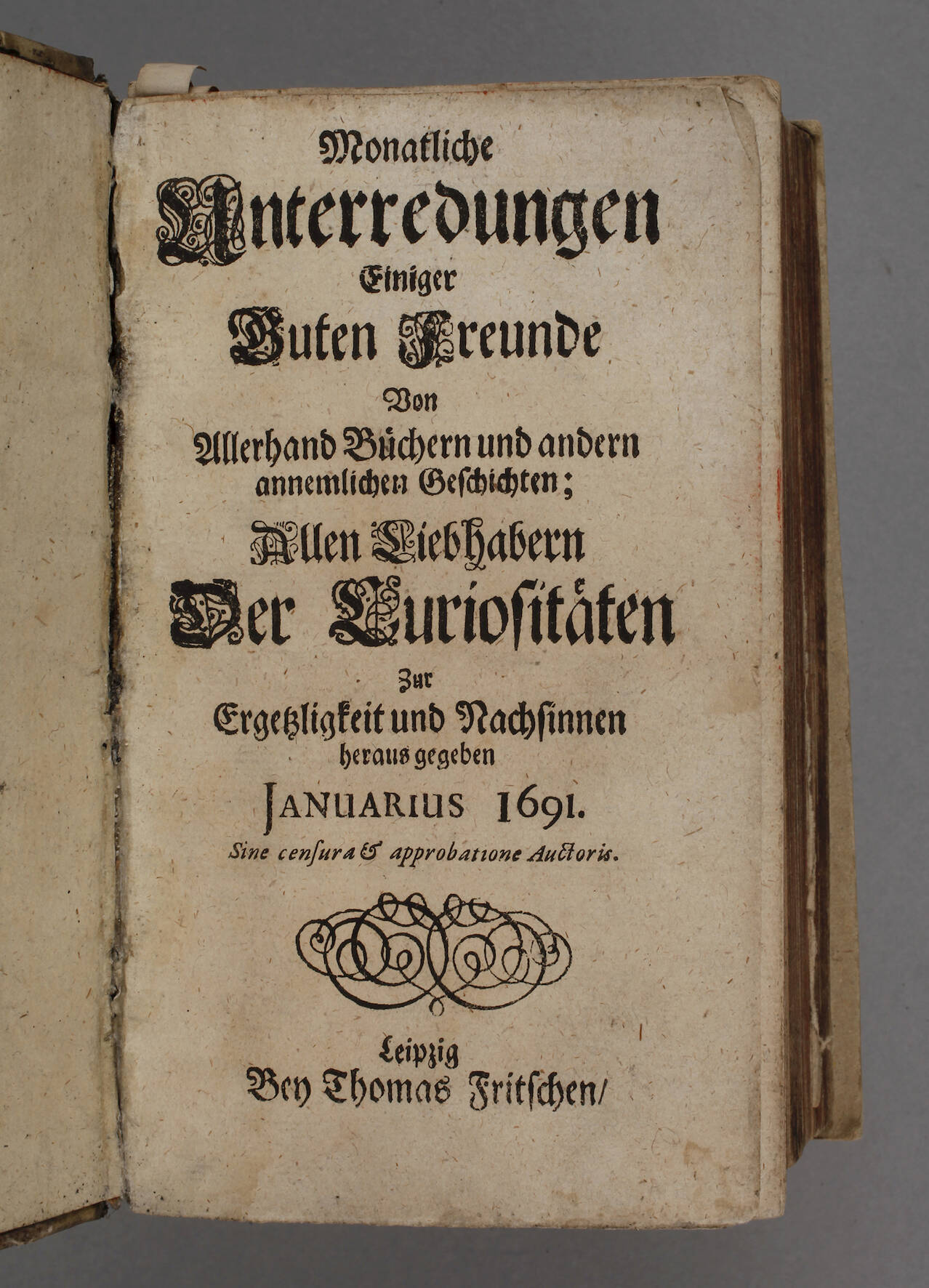 einiger guten Freunde von allerhand Büchern und andern annemlichen Geschichten; Allen Liebhabern der Curiositäten zur Ergetzligkeit und Nachsinnen herausgegeben, Jahrgang 1691, Format Kl. 8°, 1052 S. und Register, wenige Kupferstiche, ehemaliger Pergamenteinband, Deckel nicht erhalten, befriedigender Zustand.