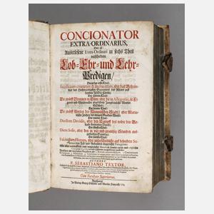 das ist: Auserlesene Extra-Ordinari in sechs Theil verschiedene Lob-, Ehr- und Lehr-Predigen, Augsburg 1713, Format 4°, 180, 170, 158, 202, 352 und 202 S., geprägter Pergamenteinband der Zeit, Schließen defekt, zwei Kupferstichfrontispize, altersgemäß gut erhalten.