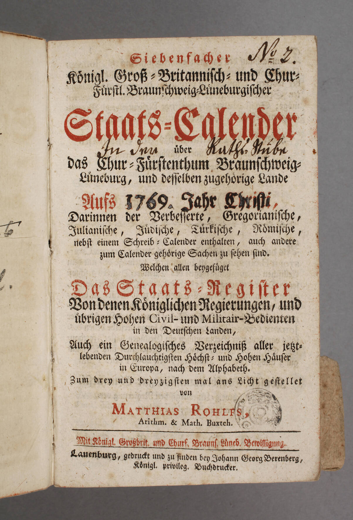 Siebenfacher königl. Groß-Britannisch- und Churfürstl. Braunschweig- Lüneburgischer Staats-Calender über das Chur-Fürstenthum Braunschweig-Lüneburg [...] von Matthias Rohlfs, Lauenburg, Format Kl. 8°, 30 Blatt, 192 S., 20 Blatt, Titelseite handschriftlich bezeichnet mit "In der Raths-Stube des O.A.Gerichts", Pappeinband der Zeit, altersgemäß gut erhalten.