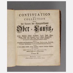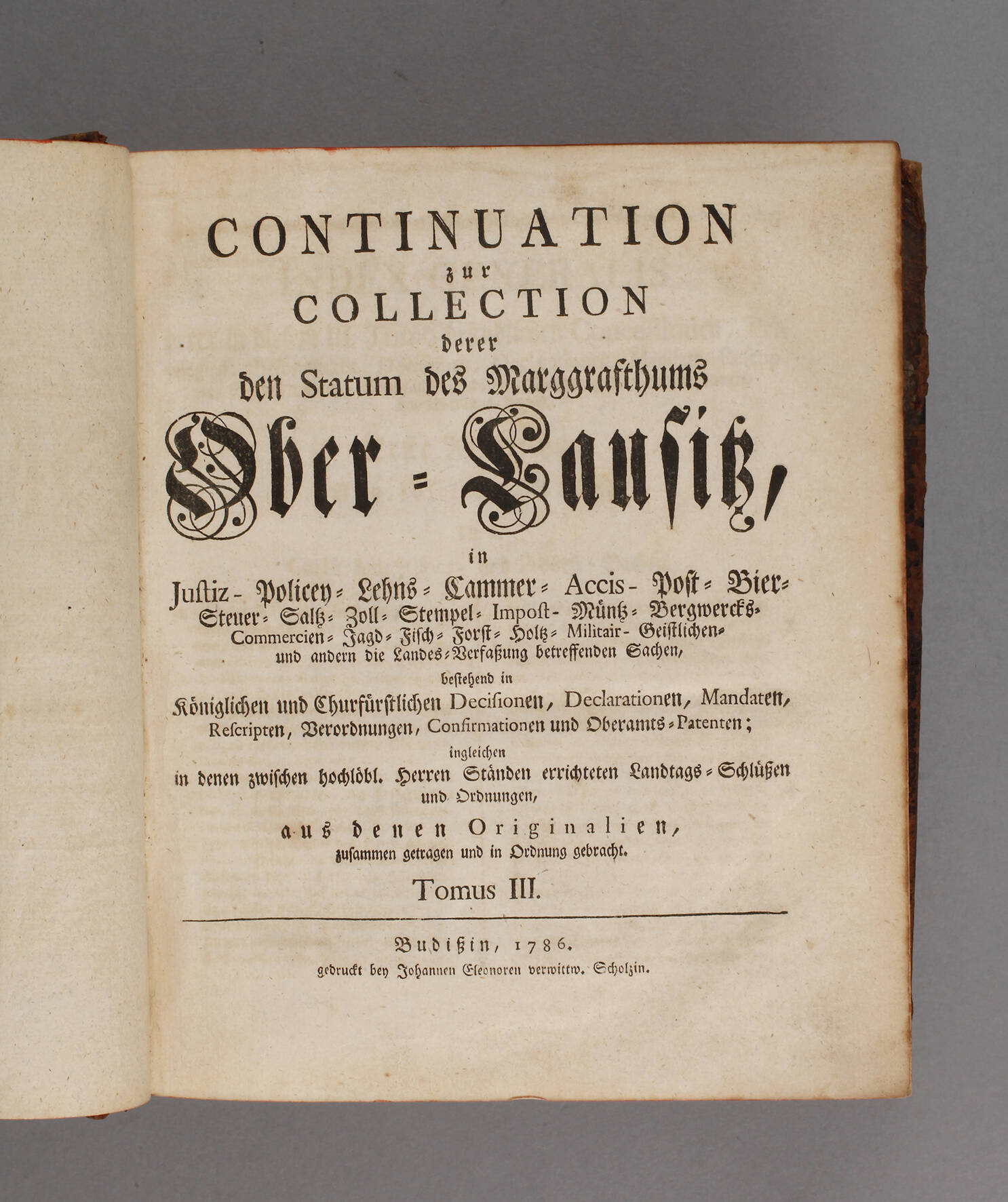 derer den Statum des Marggrafthums Ober-Lausitz, in Justiz-, Policey-, Lehns-, Cammer-, Accis-Post-, Bier-Steuer-, Zoll- [...] aus denen Originalien zusammen getragen und in Ordnung gebracht, Tomus III, Budißin 1786, Format Lex. 8°, 974 S., eine gefaltete Tafel mit Straßendammquerschnitt, originaler Ledereinband, marmorierter Schmuckvorsatz, Rotschnitt, altersgemäße Erhaltung.