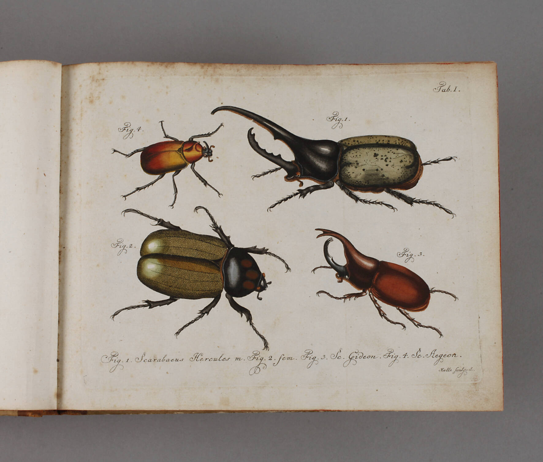 [als eine Fortsetzung der von Buffonschen Naturgeschichte. Nach dem System des Ritters Carl von Linne bearbeitet von Carl Gustav Jablonsky, fortgesetzt von J. F. W. Herbst], Käfer, Theil 1 bis 8, Berlin bei Pauli 1785 bis 1799, einschließlich Tafel CXXXVII vollständig mit 160 kolorierten Tafeln, Plattenmaße je ca. 17 x 21,5 cm, gebunden im Halblederband mit Rückenschildchen und Tafelzählung, Rotschnitt, normale Altersspuren, schön erhalten.