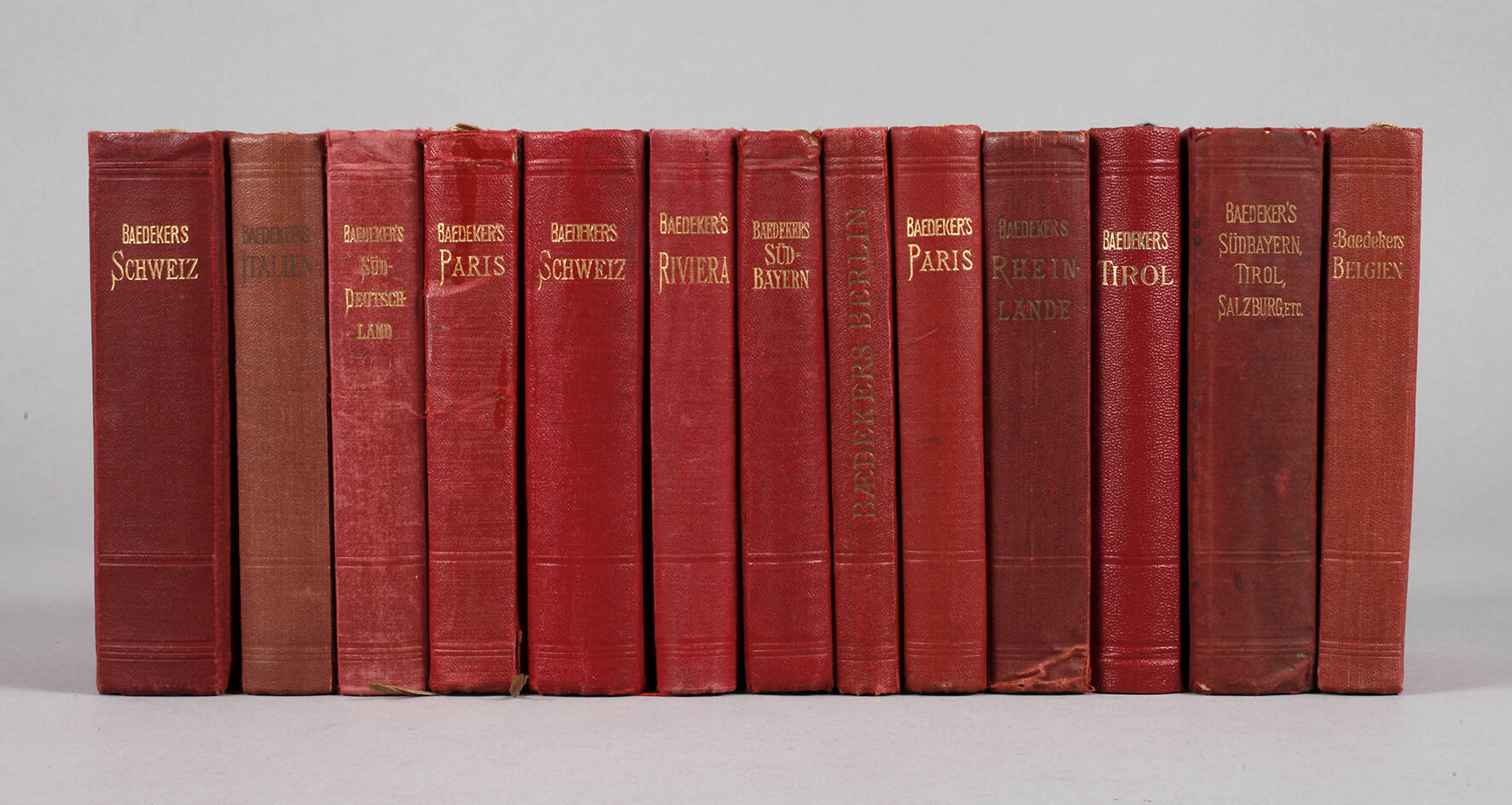 13 Stück: Belgien und Luxemburg 1930. – Rheinlande o. J. – Italien von den Alpen bis Neapel 1931. – Schweiz 1927. – Südbayern 1925. – Riviera 1906. – Schweiz 1920. – Paris und Umgebung 1923 (2 x). – Südbayern/Tirol und Salzburg 1898. – Tirol 1938. – Süd-Deutschland 1903. – Berlin und Umgebung 1921; unterschiedliche Erhaltungen.