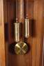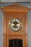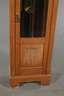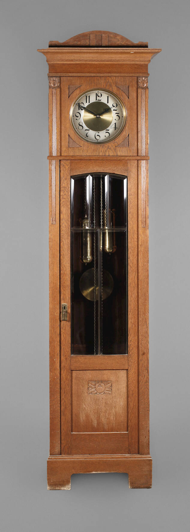 um 1910, ungemarkt, schlichtes Gehäuse aus massiver Eiche, hellbraun gebeizt, Tür mit messinggefassten, facett geschliffenen Scheiben, zwei Gewichte, Werk mit Halbstundenschlag auf zwei Tonspiralen, funktionstüchtig, normale Altersspuren, Maße 212 x 59 x 32 cm.