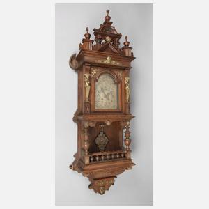 Firma Gustav Becker, um 1890, Gehäuse aus massiver Eiche, verziert mit feinen Bronzeapplikationen, das Werk rs. gemarkt, mit Halbstundenschlag auf Tonfeder, fein geätztes Zifferblatt aus Messing, flankiert von zwei Karyatiden, Werk überholungsbedürftig, minimale Fehlstellen, sonst guter unrestaurierter Originalzustand, H 125 cm.