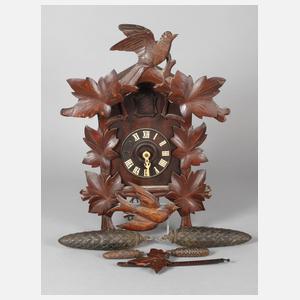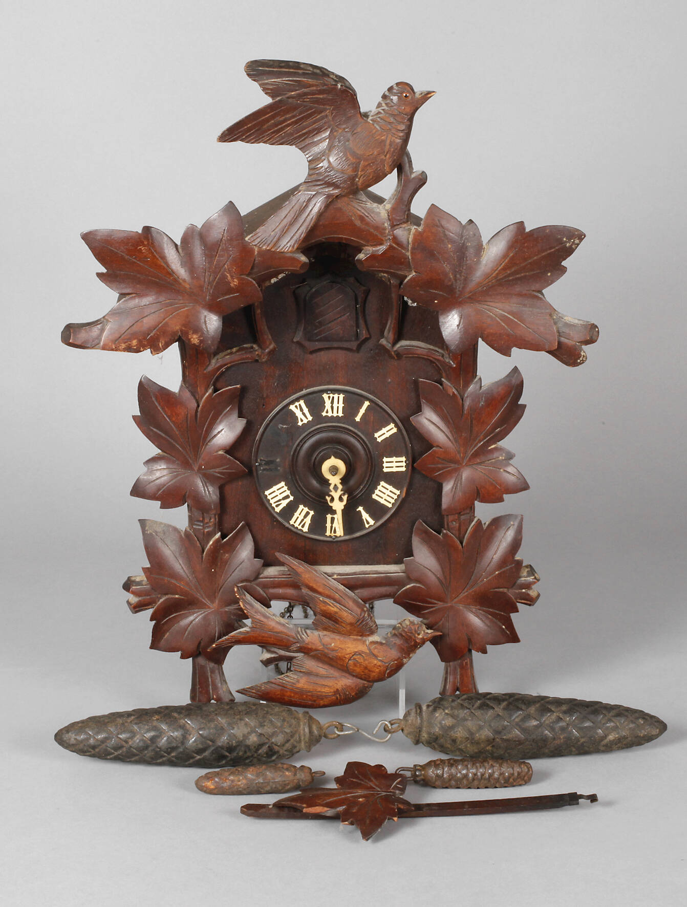 Schwarzwald, um 1900, Messingplatinenwerk mit Halbstundenschlag auf Tonfeder, originale Gewichte und Pendel, Blasebalge, ein Zeiger und eine Ziffer fehlen, Werk gehfähig, ein Blatt bestoßen, H 46 cm.