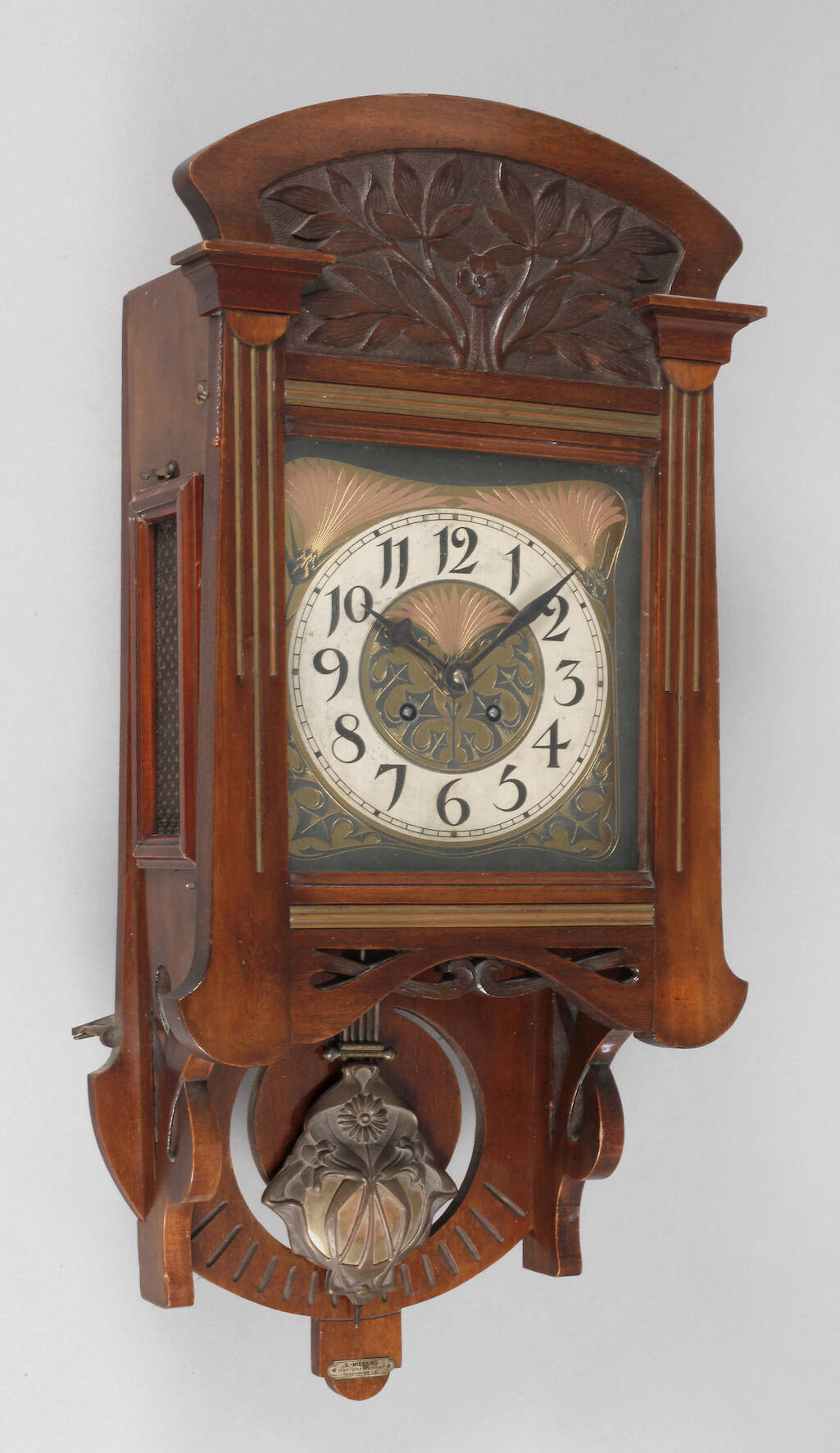 deutsch, um 1900, gemarkt G. Wiebking, Hofuhrmacher in Oldenburg, Gehäuse aus massivem Mahagoni, fein geätztes Zifferblatt mit Jugendstilmotiven, teils dunkel patiniert, versilbert und vergoldet, Werk mit Halbstundenschlag auf Tonfeder, funktionstüchtig, guter Zustand, L 72 cm.