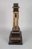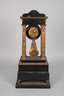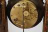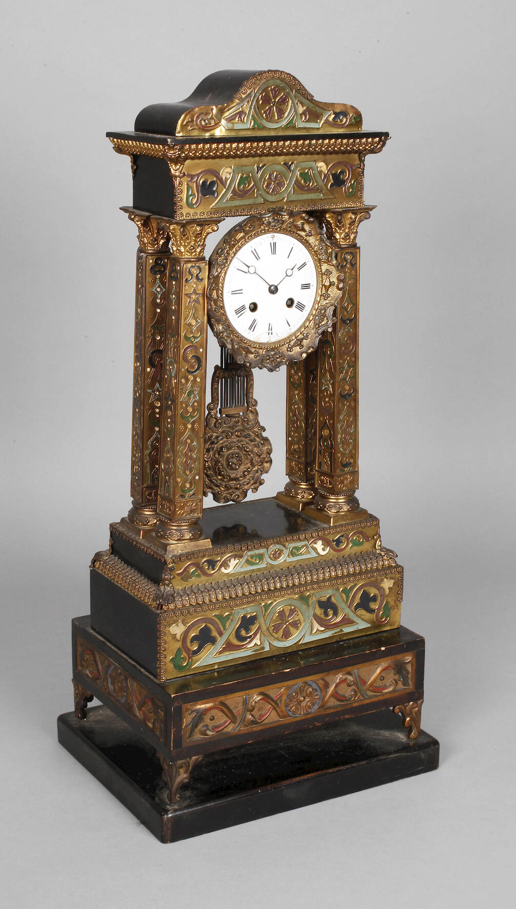 Frankreich, 2. Hälfte 19. Jh., auf Werkplatine gemarkt Marti & Cie., Exportmodell für den arabischen Raum, ebonisiertes Holzgehäuse, verziert mit farbig gefassten Messingapplikationen, typische Motive wie Moschee und Halbmond, emailliertes Zifferblatt mit römischen Zahlen (reparierter Ausbruch bei der 6), Gehäuse mit Altersspuren, Werk funktionstüchtig, Glocke fehlt, H 64 cm.