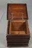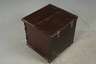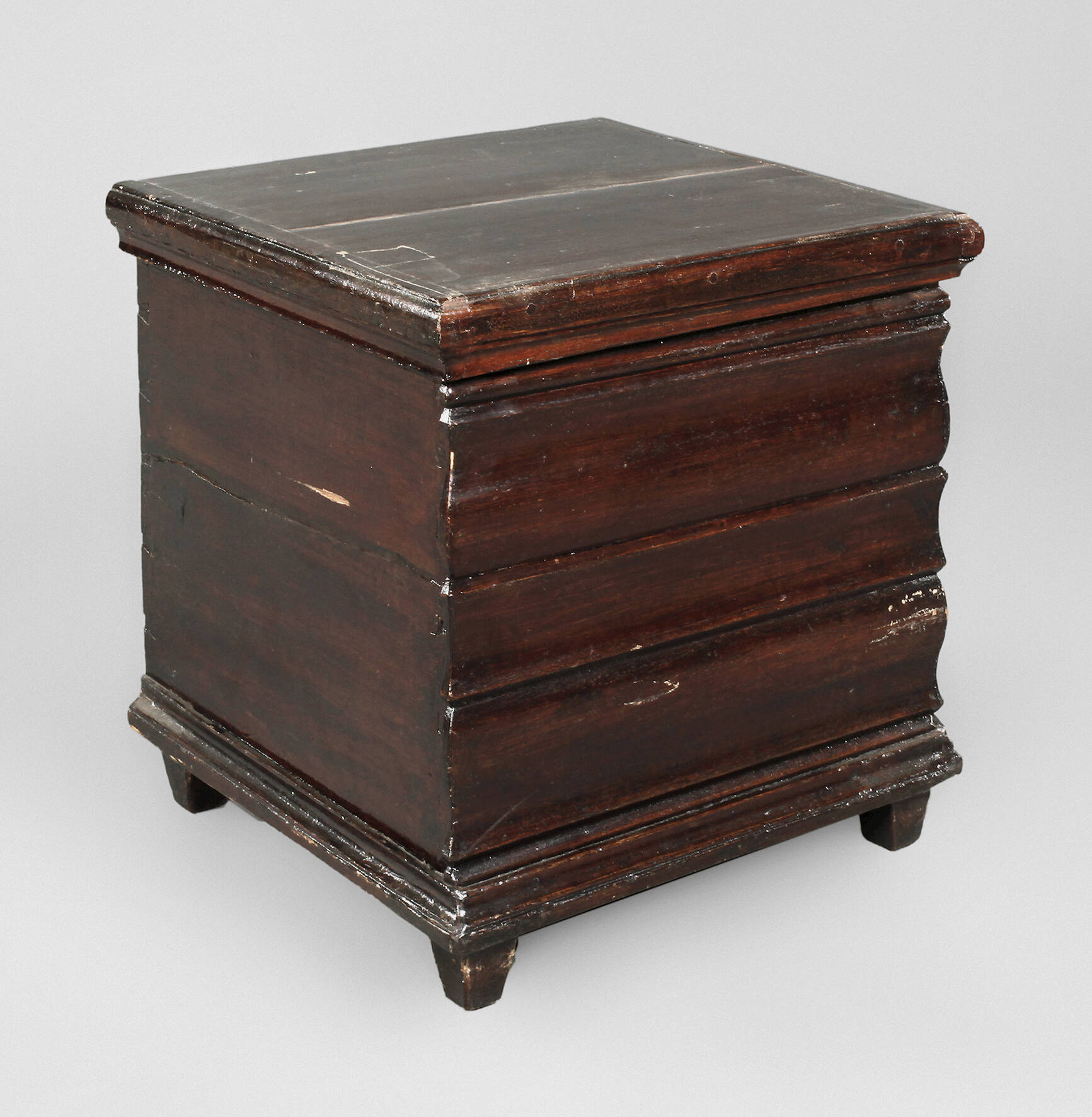 Eiche massiv, wohl Nürnberg, 18. Jh., außergewöhnliche Flachdeckeltruhe in Würfelform, mit wellenförmig gestalteter Front, innen kleine Beilade, Oberfläche überstrichen, Maße 48 x 48 x 46 cm.