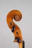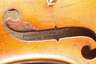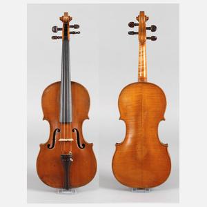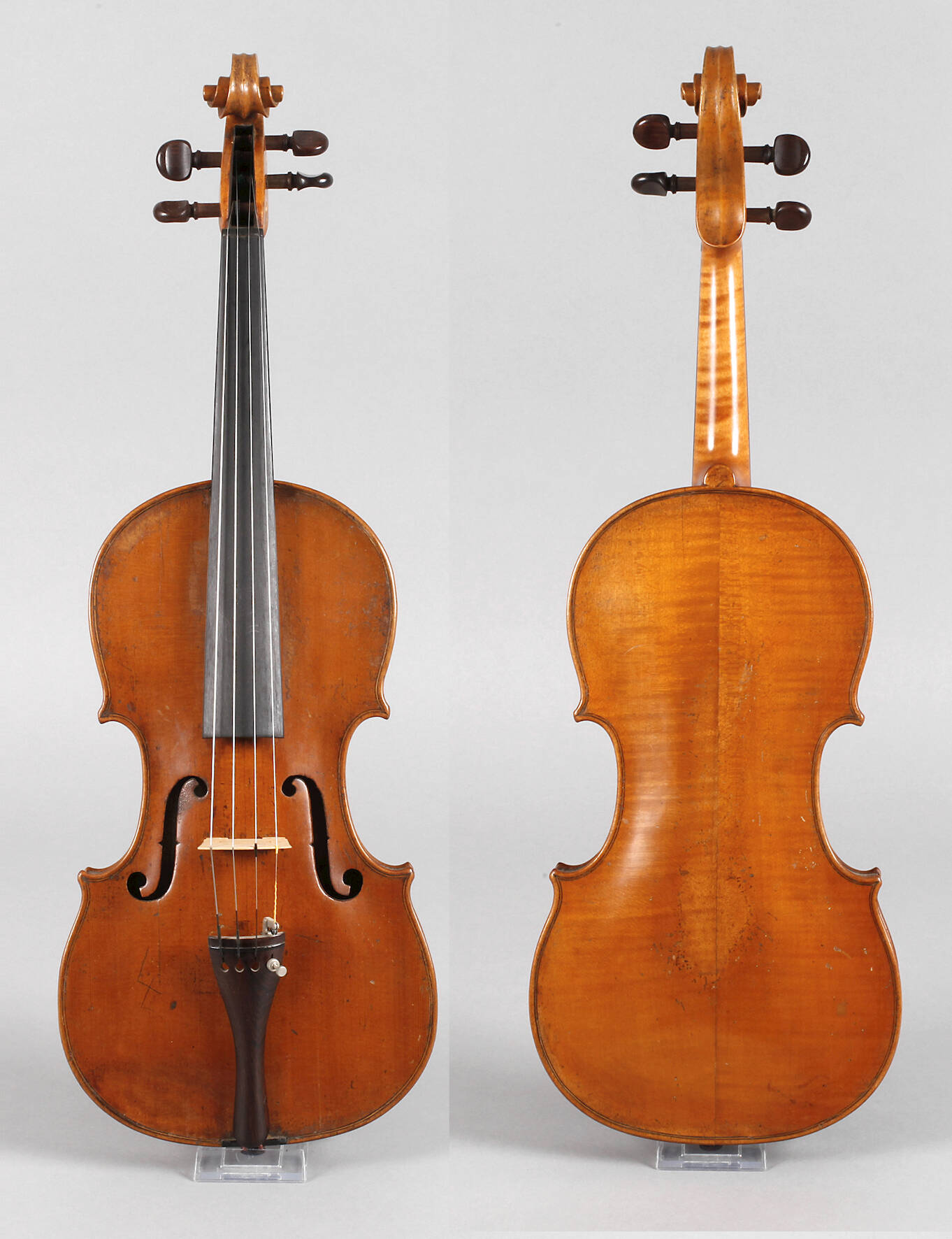 auf Klebezettel bez. Franz Simon, Geigenmacher in Mittenwald No 26 und dat. 1855, geteilter, kaum geflammter Boden im gelblichen Lack, umlaufende dreiteilige Randeinlage, Decke mit verfestigter Rissbildung, Alters- und Gebrauchsspuren, L Korpus 35,6 cm.