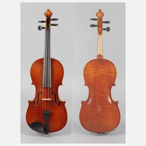 Anfang 20. Jh., ohne Zettel, geteilter, sehr gleichmäßig geflammter Boden in bernsteinfarbenem Lack, umlaufende dreiteilige Randeinlage, Decke mit kurzer verfestigter Rissbildung, gepflegter, spielbereiter Zustand mit leichten oberflächlichen Gebrauchsspuren, L Korpus 36,4 cm.