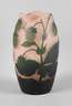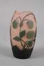 Lausitzer Glas in französischer Marnier um 1921-1929, hochgeätzte Signatur, farbloses Glas mit roséfarbenem Unterfang, der Überfang aus grünem Glas, geätzt und graviert, Erdbeerranken mit Früchten, der Mündungsrand wohl beschliffen, H 13,5 cm.