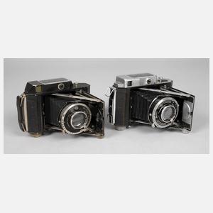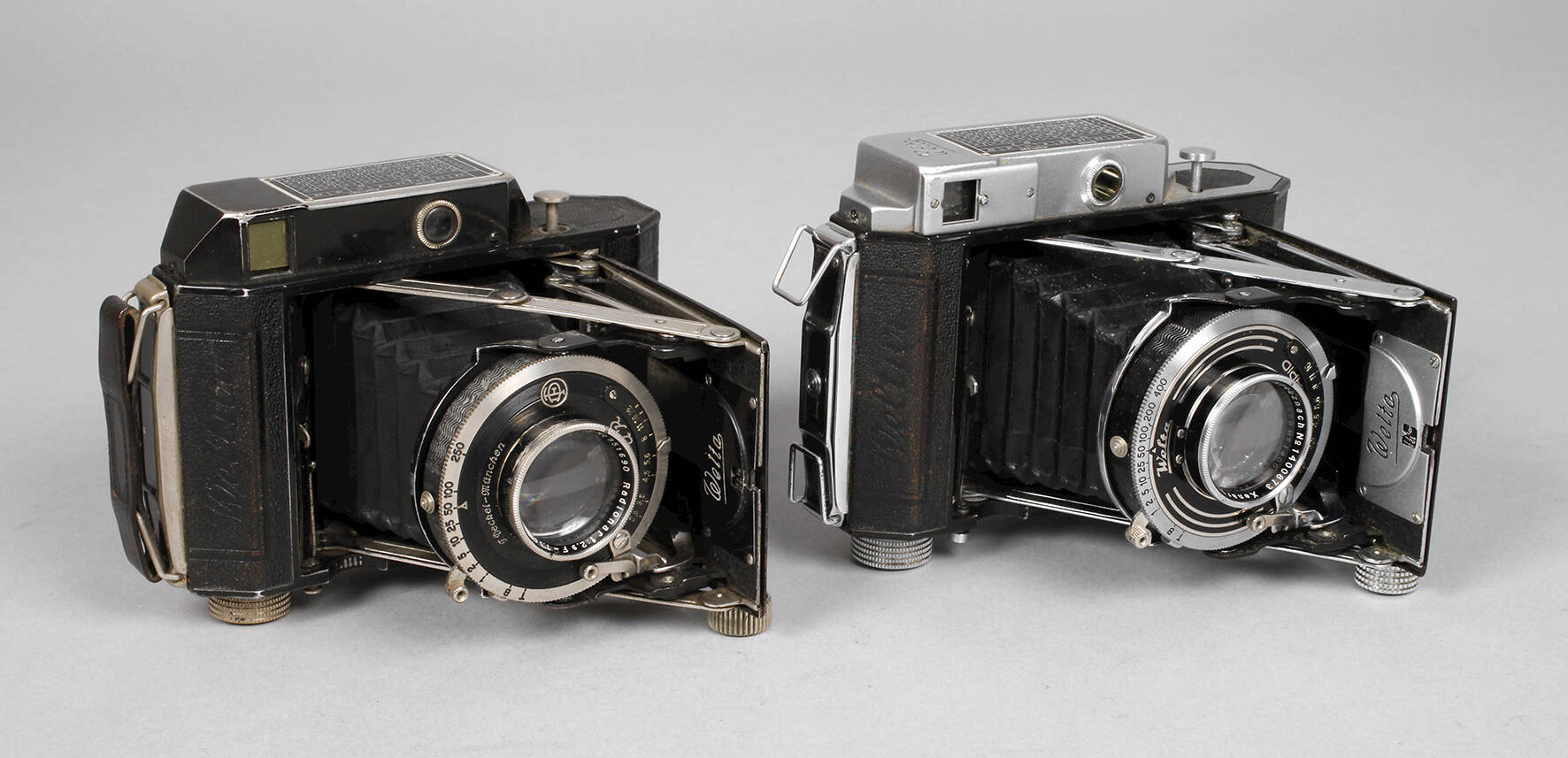 Mitte 20. Jh., teils lederummanteltes Metallgehäuse, Objektive gemarkt Compur bzw. Compur Rapid, eins Radionar 1:2,9, F=7,5, das andere Xenar f:2,8, F=7,5, Alters- und Gebrauchsspuren, Funktion nicht geprüft.