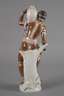 Aelteste Volkstedter Porzellanmanufaktur, Entwurf Arthur Storch 1922, blaue Stempelmarke ab 1945, Entwerfermonogramm mit Datierung, naturalistische Ausformung in Porzellan mit polychromer Aufglasurbemalung und sparsamer Goldstaffage, auf Rundsockel mit Baumstammstütze sitzende Frau mit Lendenschurz, auf der Schulter einen Krug balancierend, seltene Figur, Kopffeder und Löffelstiel bestoßen, sonst guter Zustand, H 33 cm.