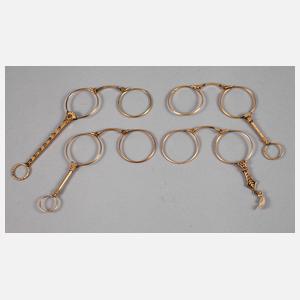 um 1900, Messing vergoldet, ein Modell verziert von farbigen Glascabochons, ohne Glas, funktionstüchtig, Gebrauchsspuren, L max. 14,5 cm.