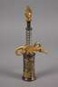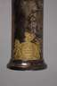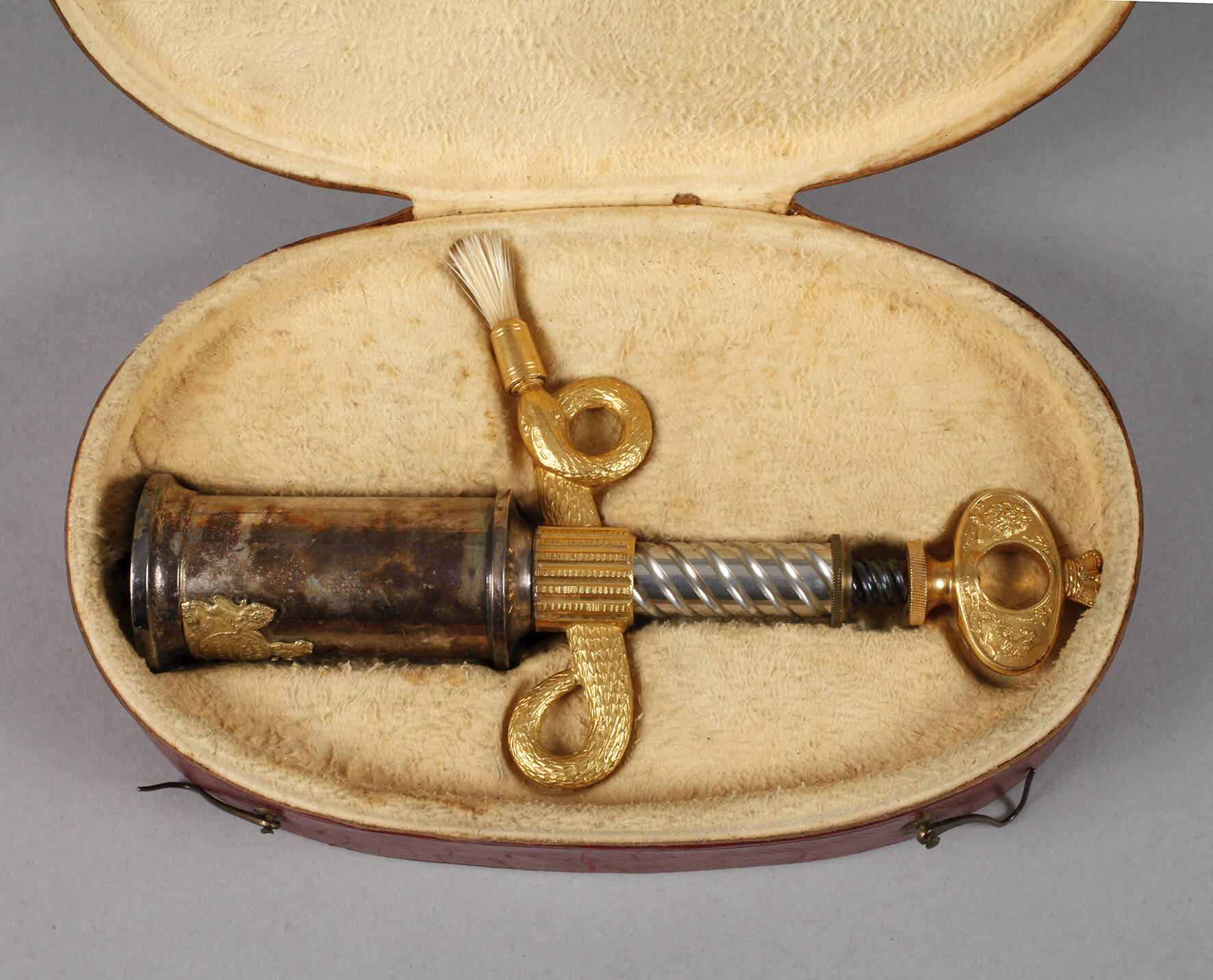 um 1805, Gusseisen versilbert bzw. vergoldet, die Front verziert von reliefierter Plakette, gemarkt Thomasons Patent ne plus ultra in Wappenkartusche, gerahmt von Löwe und Einhorn, mit Schriftband Dieu et mon troit, Modell mit zwei ineinandergreifenden Gewinden, verziert von Schlangenmotiv, mit kleinem Pinsel aus Naturborsten, im original, ziegenlederbezogenem Etui, L dieses 21 cm.