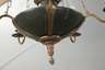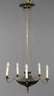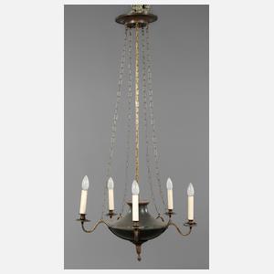 um 1810, an zarten Gliederketten abgehängter, ebonisierter Holzbaluster, Messingmontierungen, sechs s-förmig geschwungene Leuchterarme, je eine Kerzentülle tragend, nachträglich elektrifiziert, Altersspuren, H ca. 130 cm, D ca. 60 cm.