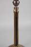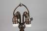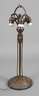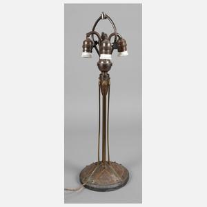 um 1905, Messing zaponiert, teils vergoldet, Rundfuß verziert von geometrischer Ornamentik, schlanker vierstrebiger Leuchterarm, vierflammig elektrifiziert, ohne Schirm, Altersspuren, Elektrik rep.bed., H 64 cm.