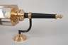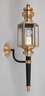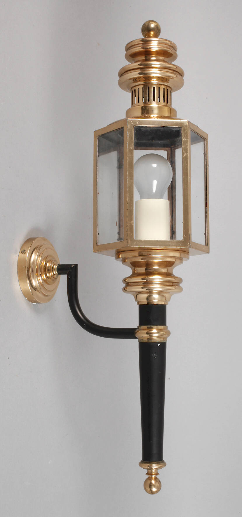 20. Jh., Ausführung Vereinigte Werkstätten München, ungemarkt, Außenleuchte in historisierender Formensprache, teils geschwärztes bzw. poliertes Messinggehäuse, zentrale, polygonal facettierte verglaste Laterne, einflammig elektrifiziert, leichte Altersspuren, H 70 cm.