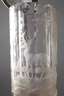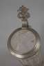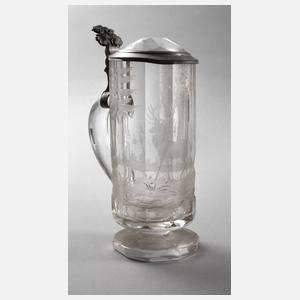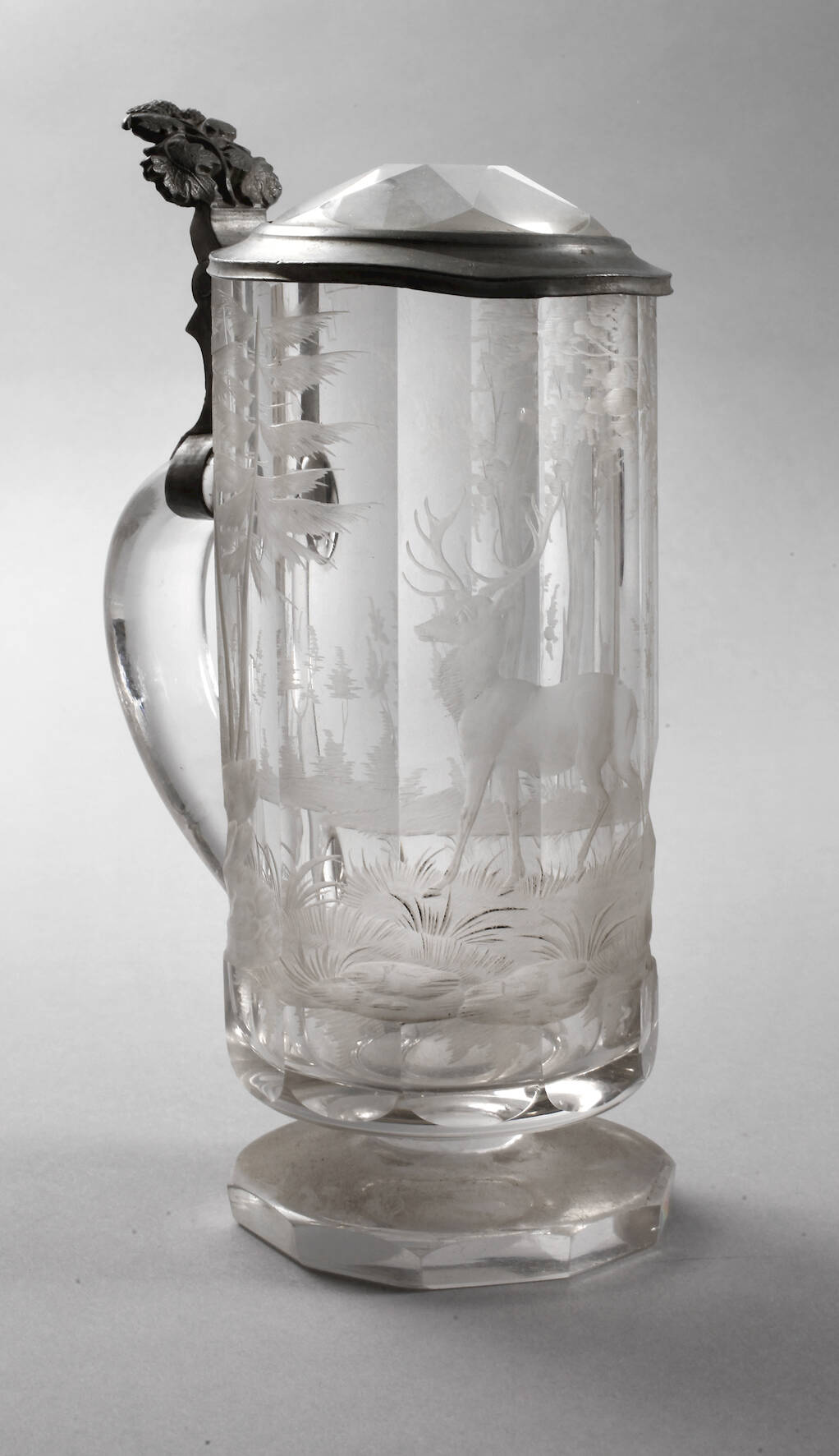 2. Hälfte 19. Jh., farbloses Glas, plangeschliffener Stand, facettiert und mattgeschliffen, Hirsche in Waldlandschaft, der Drücker mit Weinlaub verziert, zinngefasster Deckel mit Prisma, dieser am Rand etwas gedellt, Altersspuren, H 22,5 cm.