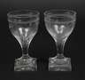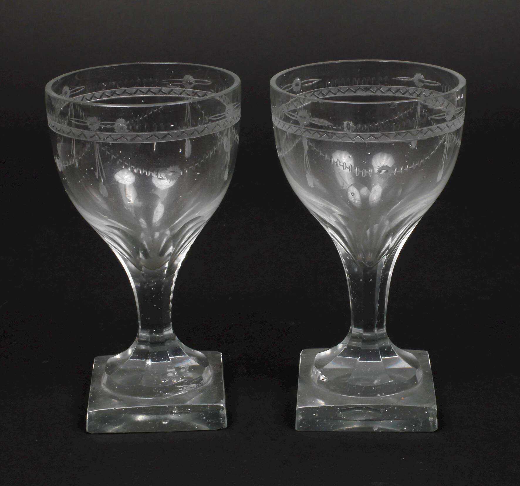 um 1800, farbloses blasiges Glas, quadratischer Stand, facettierter massiver Schaft mit geschliffenen Kanten, die Kuppa verziert mit Festons, winzigst bestoßen, H je 13,5 cm.