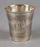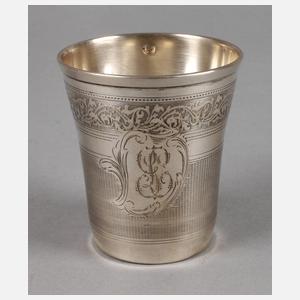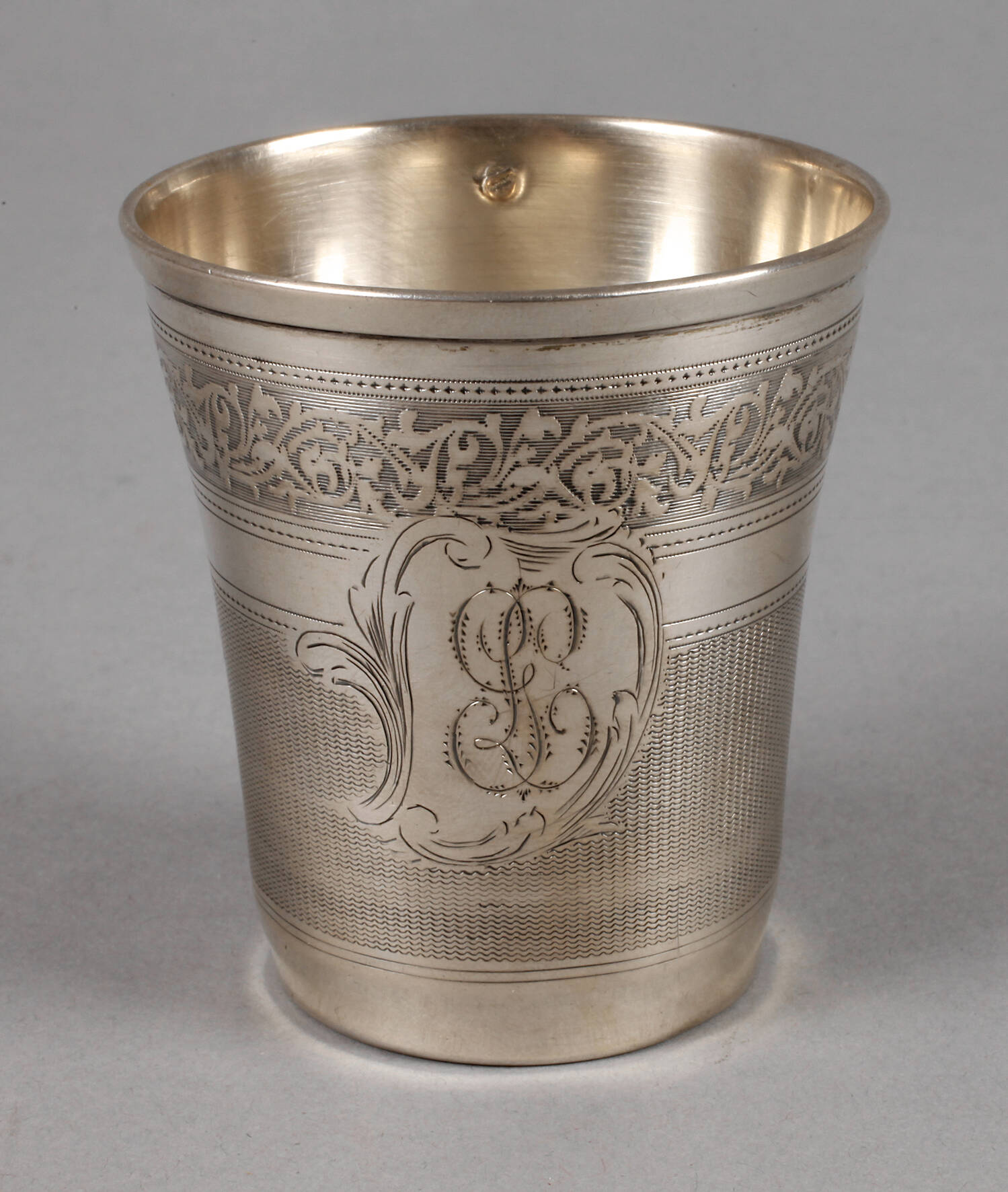 Frankreich, Ende 19. Jh., gestempelter Minervakopf, konische Form mit verstärktem Lippenrand, fein ziseliert, guter altersgemäßer Zustand, H 7,5 cm, G ca. 57 g.
