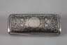 um 1890, gepunzt Gustav Adolf Scheidt sowie Dianakopf, Silber innen vergoldet, allseitig aufwendig in Niellotechnik verziert mit Quadratendekor, auf dem scharnierten Klappdeckel Rollwerk mit Blüten und ein ligiertes Besitzermonogramm, sehr guter altersgemäßer Zustand, L 8 cm, G ca. 14,4 g.