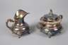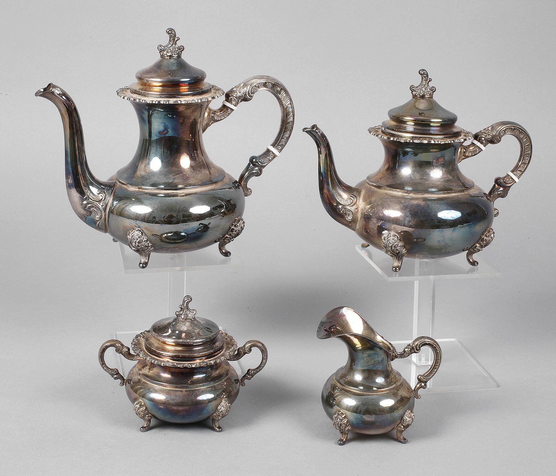 Mitte 20. Jh., Silber gestempelt Halbmond, Krone, 925, Herstellermarke GHK Meistersilber, in Barockform mit Rocaillengriffen auf ausgestellten blütenverzierten Füßen, abnehmbare Deckel, Isolierscheiben aus Horn, Kernstück mit zusätzlicher Teekanne, unbenutzt, in guter Erhaltung, H 20 cm, G zusammen ca. 1.287,9 g.