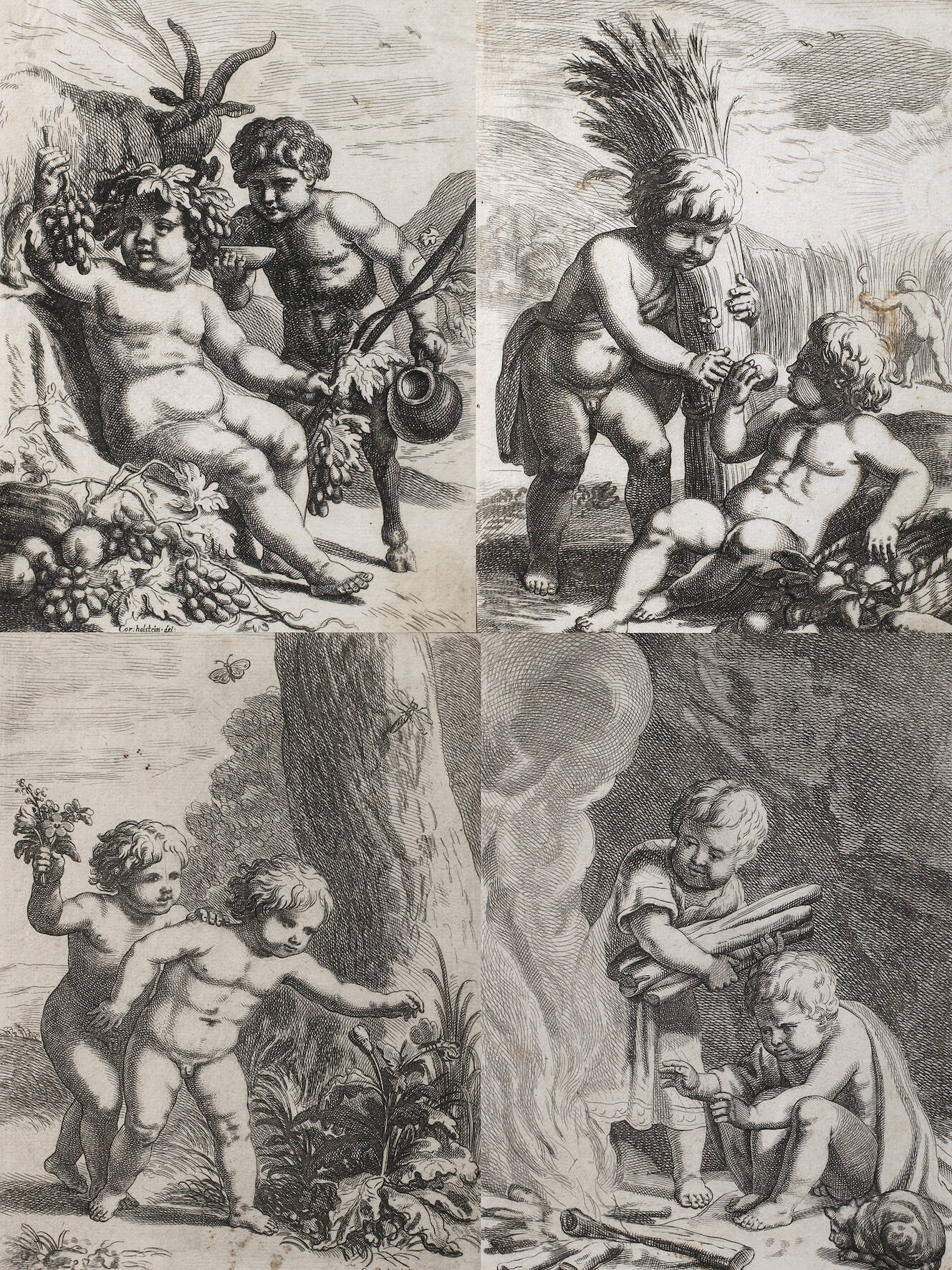 vier Blatt mit Darstellung von Putti in jahreszeittypischer Beschäftigung, Kupferstiche, Mitte 17. Jh., jedes Blatt in der Darstellung signiert „Cor. Holstein del.“, unterschiedliche Erhaltungen, je unter Passepartout und hinter Glas gerahmt, Darstellungsmaße max. ca. 19 x 14 cm. Künstlerinfo: niederl. Maler (1618 Haarlem bis 1658 Amsterdam), Schüler seines Vater Pieter Holsteijn I, 1647 Umzug nach Amsterdam, wird 1652 Bürger der Stadt Amsterdam, Quelle: Thieme-Becker und Wikipedia.