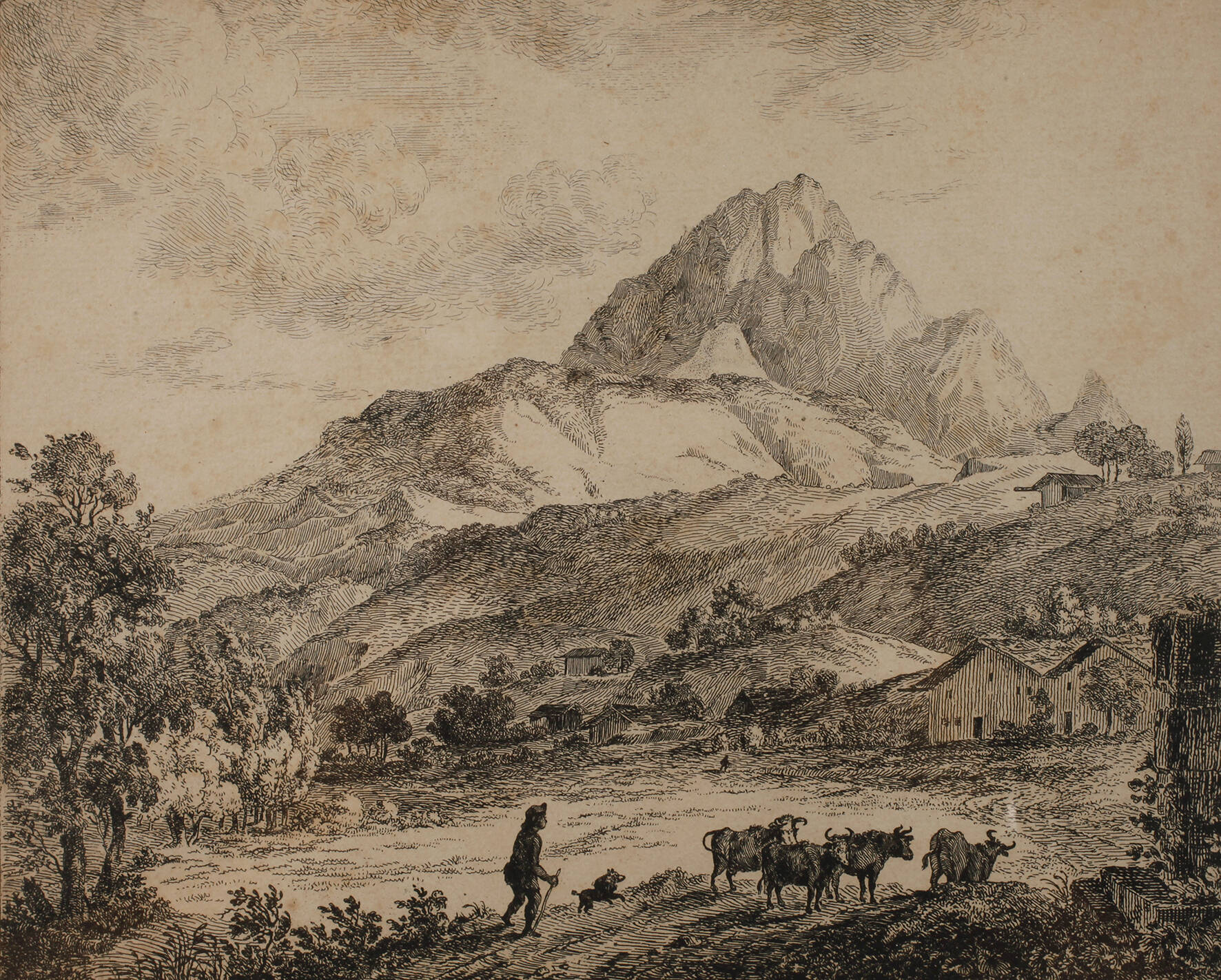 Blick auf die imposante Felsformation in den Alpen, Radierung, unter der Darstellung rechts signiert und datiert „St. v. Stengel 1803“ und mittig betitelt „der Wetterstein bey Mittenwald“, geringe Erhaltungsmängel, gerahmt, Darstellungsmaße ca. 20,2 x 25,3 cm. Künstlerinfo: dt. Politiker, Radierer und Zeichner (1750 Mannheim bis 1822 Bamberg), Sohn des Staatsrats Johann Georg von Stengel, Studium der Rechts-, Wirtschafts- und Staatswissenschaften in Heidelberg, ab 1778 Geheimer Kabinettssekretär des Kurfürsten Karl Theodor, ab 1784 ordentliches Mitglied der Bayerischen Akademie der Wissenschaften, ab 1789 Leiter des Finanzdepartements, setzte sich für die Trockenlegung des Donaumoos ein, Quelle: Wikipedia.