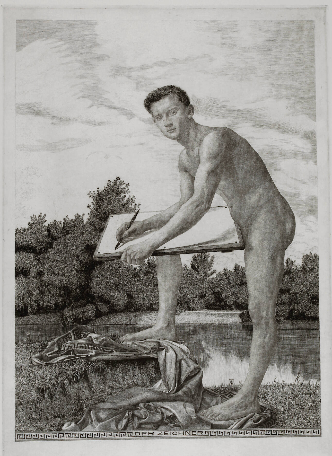 stehender nackter Jüngling mit aufmerksamem Blick zum Betrachter, beim Zeichnen am sommerlichen Seeufer, unten in der Abbildung betitelt "Der Zeichner", fein erfasste naturalistische Aktdarstellung in der Art früher Arbeiten von Max Klinger, großformatige Radierung, um 1890, unsigniert, späterer Abzug von der Originalplatte, rückseitig leicht schmutzspurig, Plattenmaß ca. 62 x 43 cm.