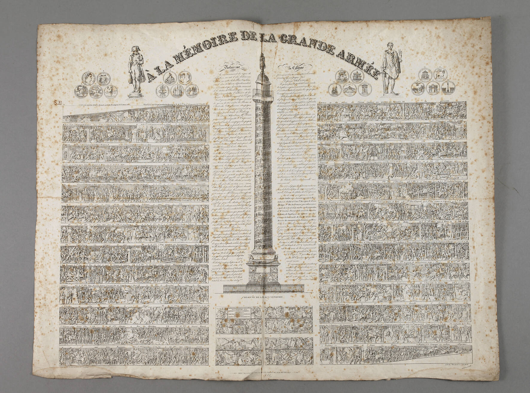 Abwicklung des Reliefs der zwischen 1806 und 1810 erbauten Säule in Paris mit Beschreibung, im oberen Bereich betitelt „A la mémoire de la Grande Armée", Lithographie, um 1820, braunfleckig, Randläsuren, Darstellungsmaße ca. 48 x 59 cm, Blattmaße ca. 51 x 67 cm.
