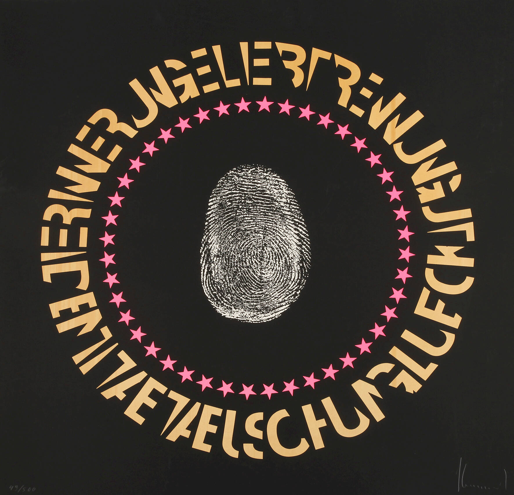 überdimensionaler Fingerabdruck, umgeben von Schriftband und Sternenkreis auf schwarzem Grund, Farbsiebdruck, um 2000, unten rechts in Blei signiert „Kriewet“ und links unten nummeriert „49/500“, minimal berieben, Maße ca. 58 x 58 cm. Künstlerinfo: dt. Hörspielautor und Künstler (1942 Düsseldorf bis 2018 Bremen), 1961 erste Arbeiten für den Rundfunk, ordentliches Mitglied des Deutschen Künstlerbundes. Quelle: Wikipedia.