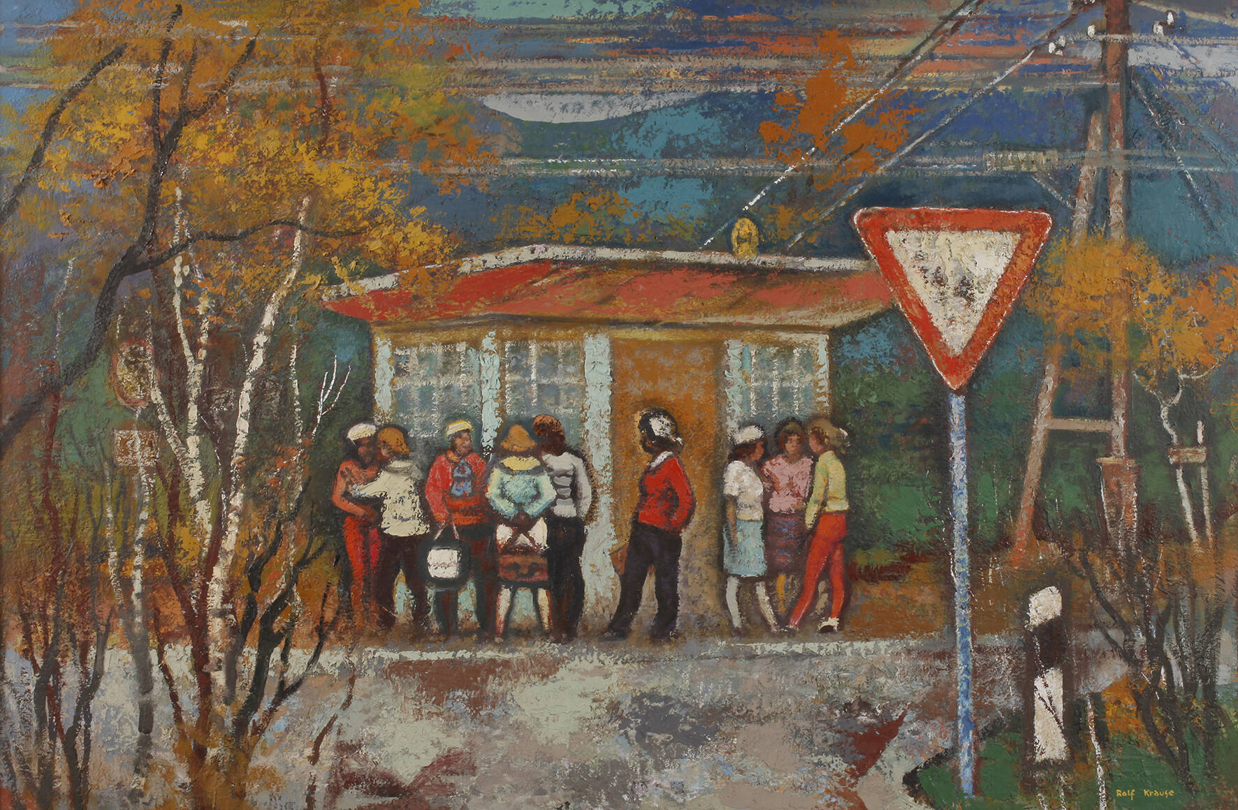 wartende Personen an einer Bushaltestelle, umgeben von Bäumen und Gesträuch, pastose Malerei, Öl auf Hartfaserplatte, rechts unten signiert „Rolf Krause“, rückseitig bezeichnet, betitelt und datiert „Rolf Krause Bushaltestelle Öl 1972“, gerahmt, Falzmaße ca. 65,5 x 98,5 cm. Künstlerinfo: dt. Maler und Graphiker (1908 Dresden bis 1982 Dresden), studierte 1926-33 an der Akademie in Dresden bei Ludwig von Hofmann, Meisterschüler von Max Feldbauer, 1933-40 freischaffend als Bildnis-, Stillleben- und Landschaftsmaler in Dresden, 1940-46 Kriegsdienst und -gefangenschaft, ab 1946 wieder freischaffend in Dresden und zunehmend Hinwendung zur Graphik, 1947 Gründungsmitglied der Künstlergruppe „Das Ufer“, 1955-68 Dozent an der Arbeiter- und Bauernfakultät der Hochschule für Bildende Künste in Dresden, 1965-68 Lehrbeauftragter an der Hochschule für bildende Künste (HBK) Dresden, Mitglied des Verbandes bildender Künstler (VBK) der DDR, tätig in Dresden, Quelle: Vollmer, Eisold „Künstler in der DDR“, Hütt „Graphik in der DDR“ und Internet.
