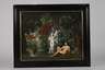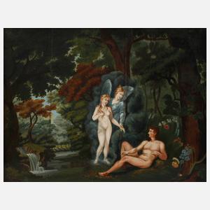 Parklandschaft mit Wasserfall und einem Engel, welcher eine nackte junge Frau zu einem unbekleideten jungen Mann führt, Öl auf Holztafel, um 1780, Craquelure, Tafel zweifach gerissen, gerahmt, Falzmaße ca. 32,5 x 40,5 cm.