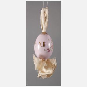 um 1900, Porzellan bedruckt, bemalt, emailliert und vergoldet, Kirschblütenzweige und kyrillisches Monogramm X.B., an cremefarbenem Seidenband, guter altersgemäßer Zustand, L 8,5 cm.