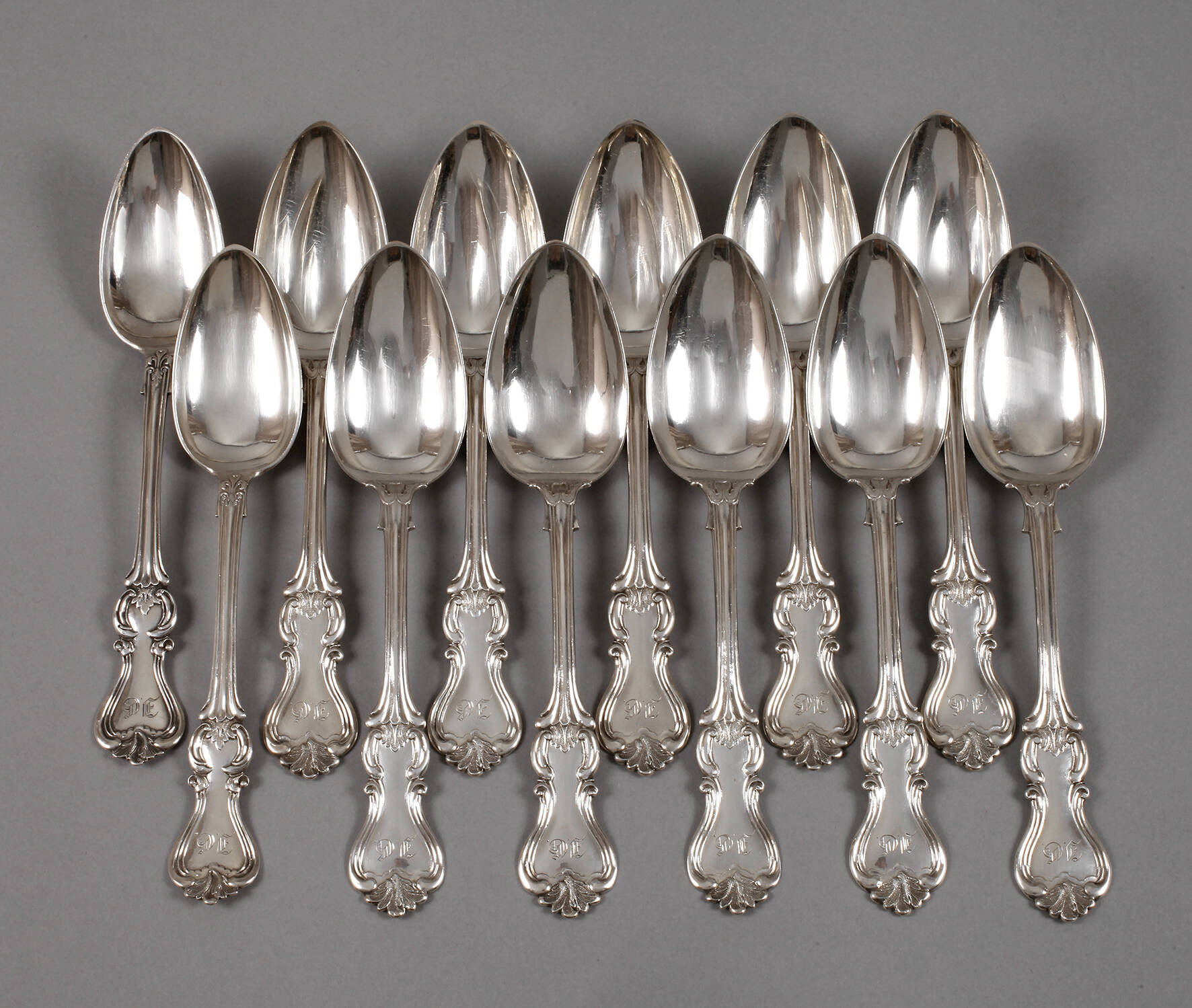 datiert 1847, Beschaumeistermarke "AT", Silberstempel 84 Zolotniki, Stadtmarke St. Petersburg, kyrillische Meistermarke Adam Yuden, tätig 1840 bis 1878, gravierte Jahreszahl 1850, Speiselöffel, die Griffe reich verziert mit eingerollten Bändern und punziertem Blattwerk, zwei Löffel anderer Marke "Knuth", geringe Gebrauchsspuren, G ca. 832 g.