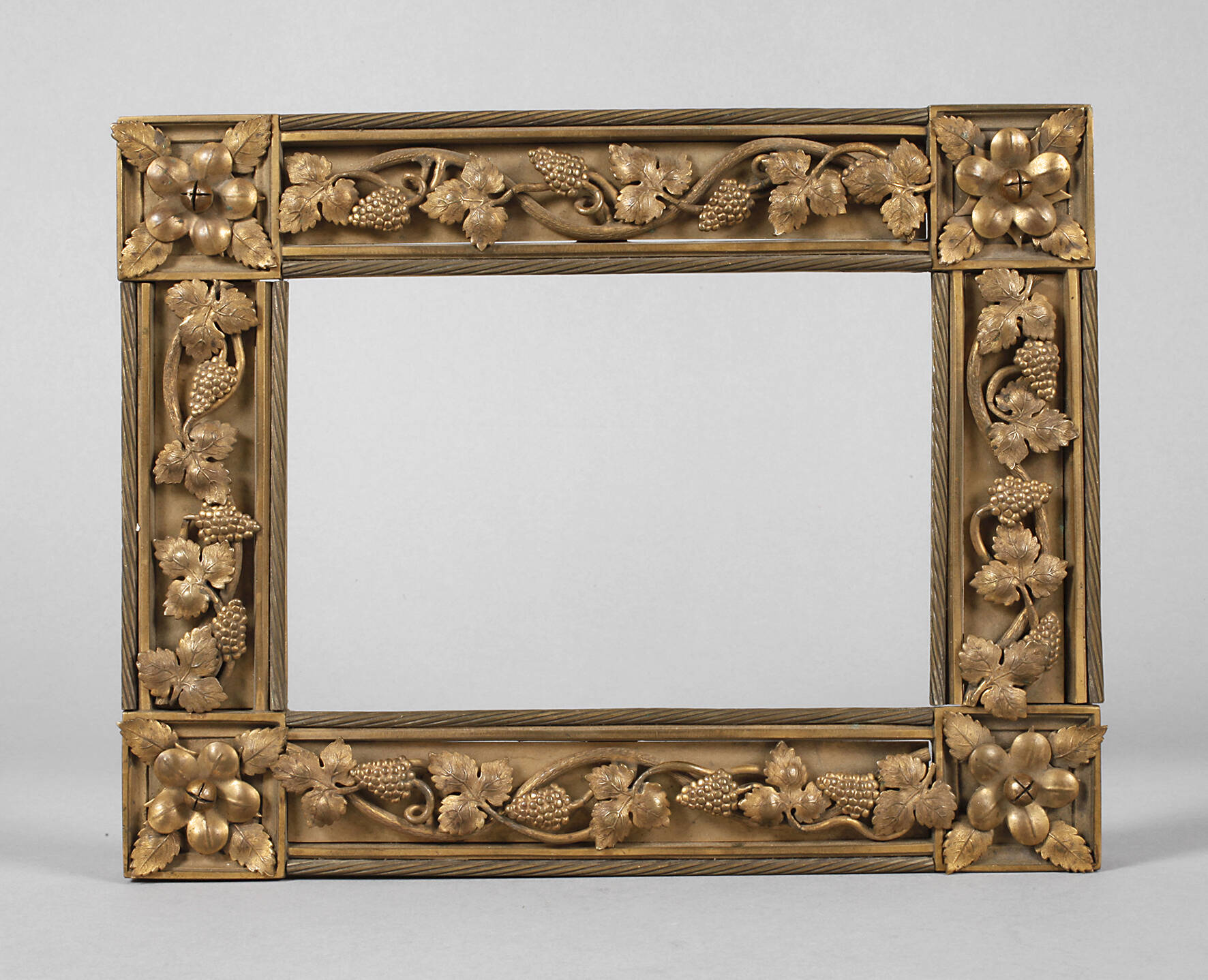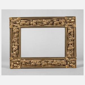 Ende 19. Jh., Bronze vergoldet, ca. 4,5 cm breite Leiste mit plastisch aufgelegten Blüten und Weinlaub, gerahmt von schlanken Spiralsäulchen, etwas berieben, Sichtmaße 11,5 x 16,5 cm.