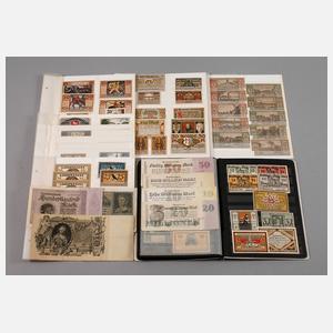 1919/21, ca. 275 Stück, dabei mehrere u. a. aus Berlin, Braunschweig, Bad Harzburg, Glauchau (11 Stück mit Spottsilhouetten), Langensalza, Weimar, Plauen, Hamburg, Kitzingen, Treffurt, Wünschendorf, Zeulenroda, Gera-Reuss, Mühlhausen, Stützerbach, Gotha, einzelne u. a. von Greußen (25 Pfennige), Greiz (Binsenteich), Jena, Merseburg, Leipzig, Rochlitz, Nordhausen, Hohenmölsen, Helgoland, Köslin, Emmendingen (Goethes Schwester und Schwager), Pößneck, Tostedt, Triebes, Eisenach; dazu Teilkonvolut von ca. 100 Reichsbanknoten, auch Sächsische Banknoten, dabei auch Notgeld des Mitteldeutschen Braunkohlebergbaues (1 Million), 500 Million Mark Leipzig, unterschiedliche gute Erhaltungen mit Umlaufspuren.