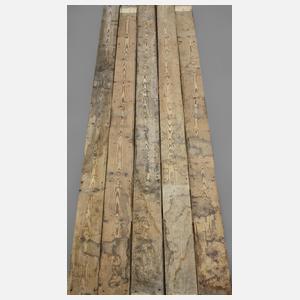 30 qm, um 1920, Nadelholz ohne Farbe, schön strukturiert, überwiegend maßhaltig, auf einer Europalette verpackt, Maße L 350 bis 480 cm, überwiegend 400 cm x B 15,5 x Stärke 2,2–2,5 cm.